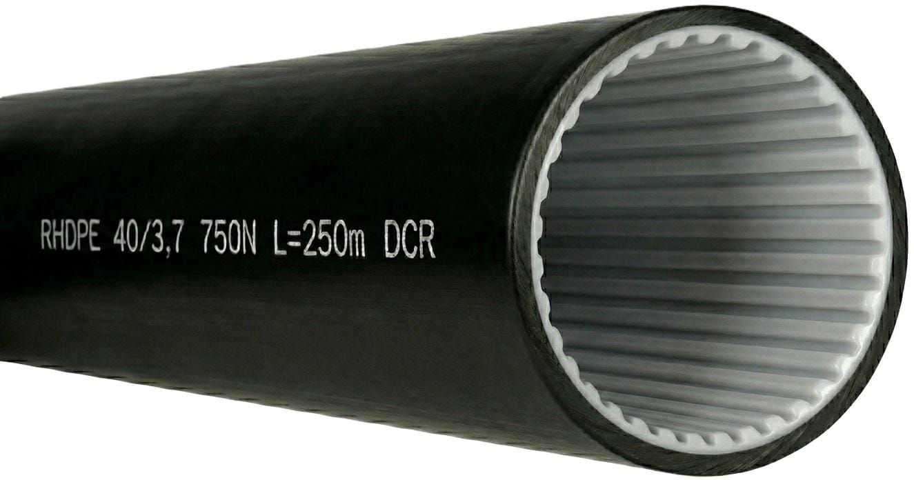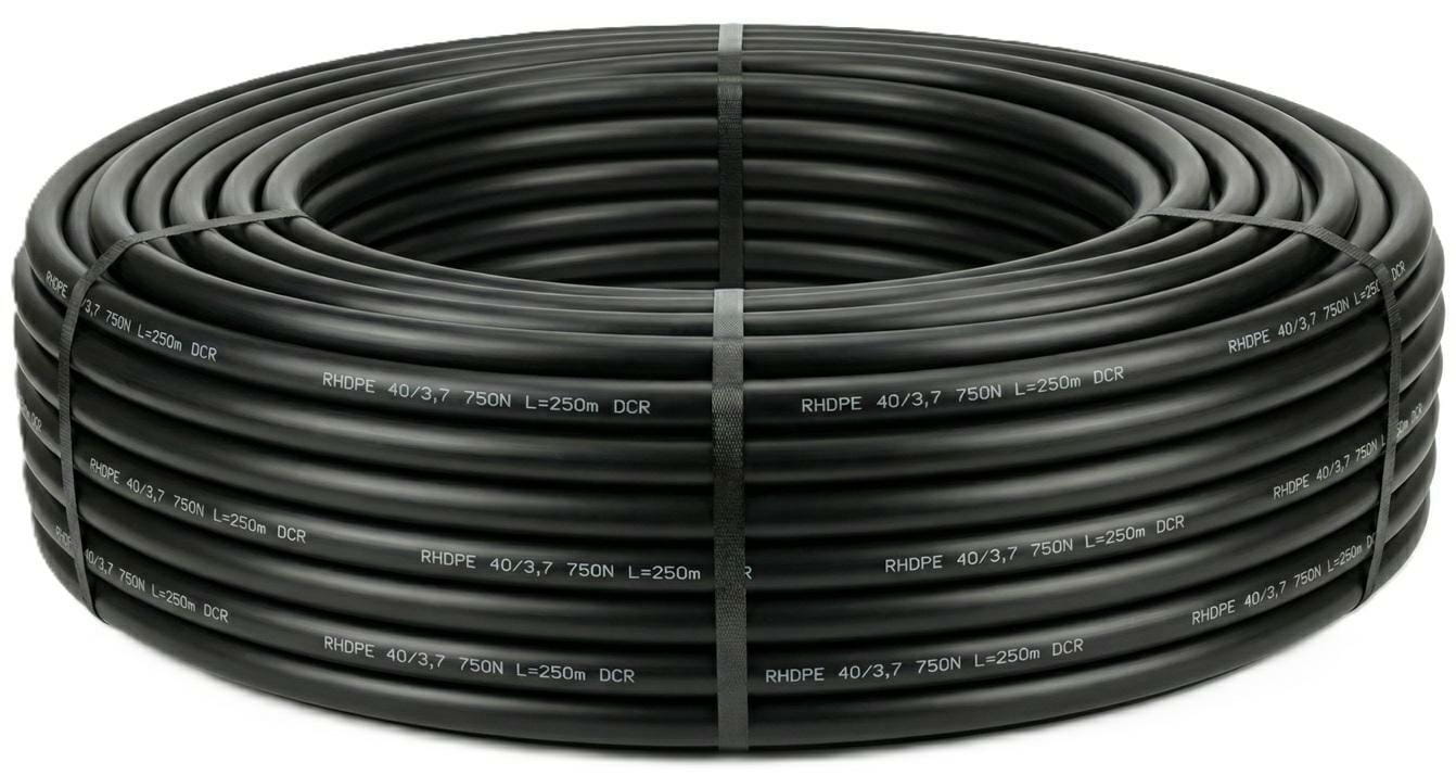 Rura osłonowa gładkościenna światłowodowa typu RHDPEwpr o wymiarze 40/3,7 mm, w kręgu 250 m. Kolor czarny. Odporność na ściskanie 750 N. Przeznaczona do ochrony i prowadzenia kabli światłowodowych w kanalizacji teletechnicznej oraz trasach zewnętrznych i ziemnych.