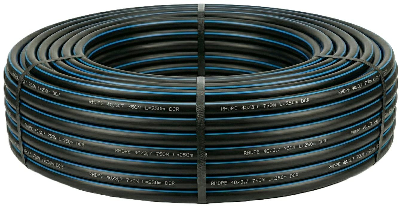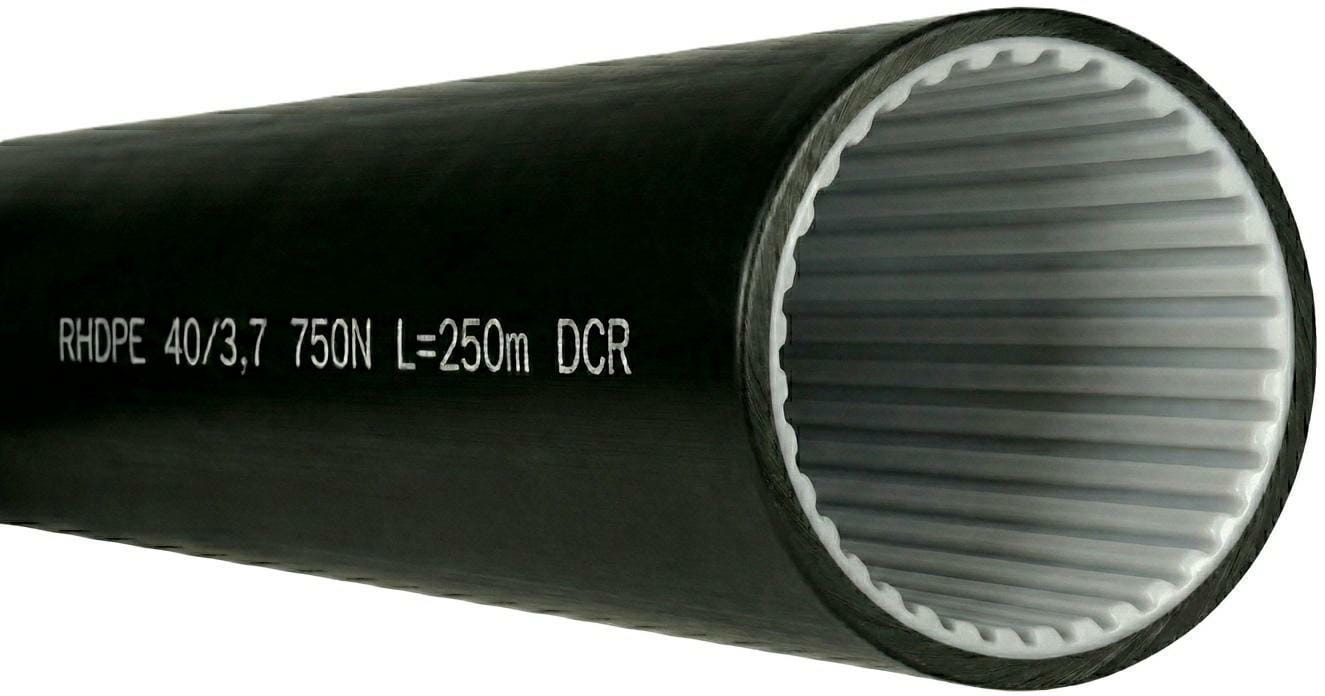 Rura osłonowa gładkościenna światłowodowa typu RHDPEwpr o wymiarze 40/3,7 mm, w kręgu 250 m. Kolor czarny, oznaczenie identyfikacyjne: pojedynczy niebieski pasek. Odporność na ściskanie 750 N. Przeznaczona do ochrony i prowadzenia kabli światłowodowych w instalacjach teletechnicznych, w szczególności w trasach zewnętrznych i ziemnych.